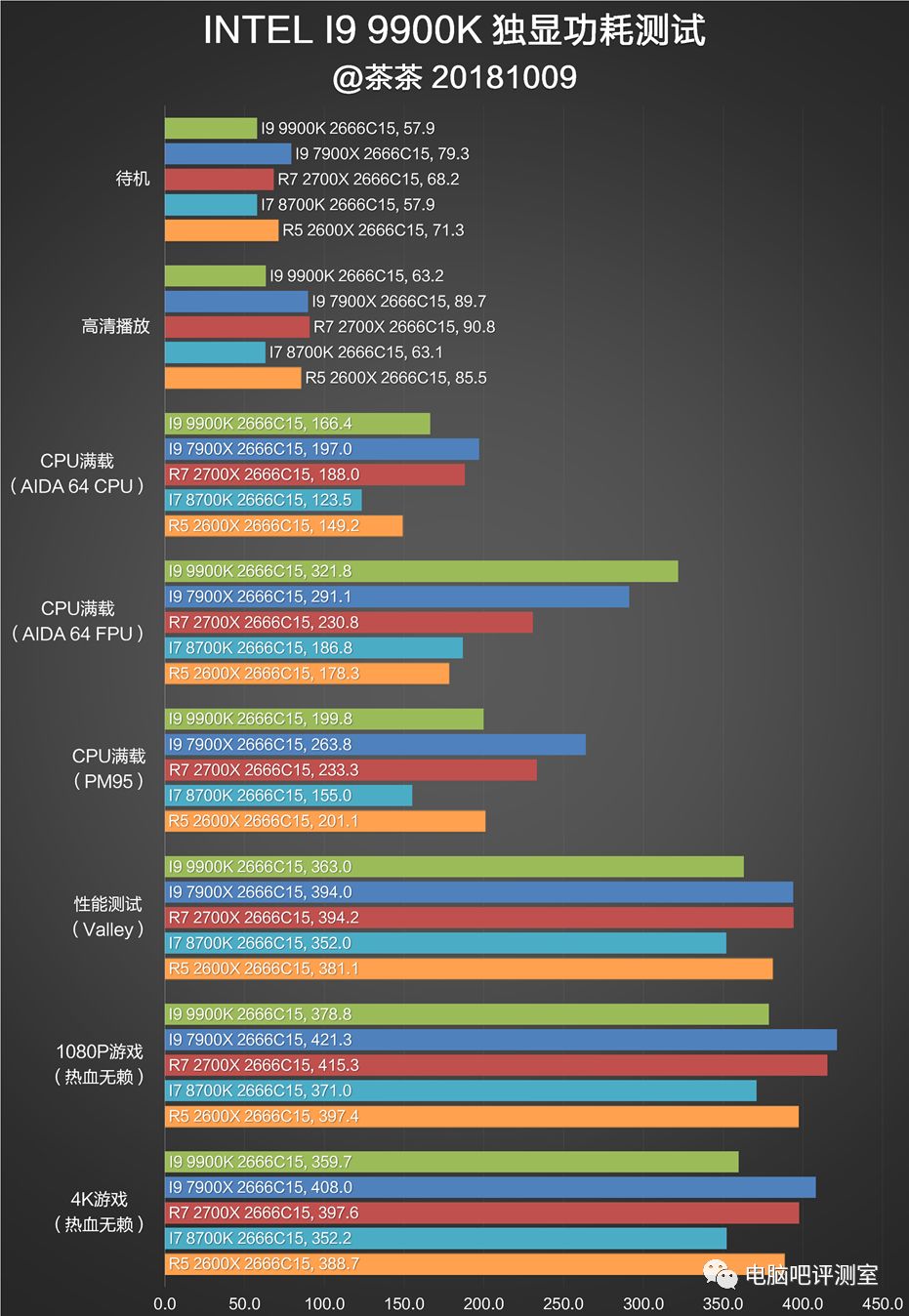 搭配独显的话功耗差异就不会那么明显,在大部分场景下I9 9900K功耗会低于R7 2700X,但是FPU测试的绿条真心显眼,甚至超过了十核的I9 7900X。