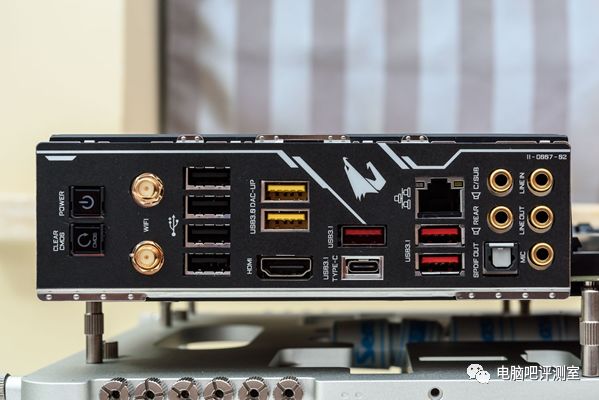 主板后窗接口相对是比较丰富的,从左起来看分别是超频按键、WIFI天线插座、USB 2.0*4、USB 3.0*2+HDMI、USB 3.1 A+C、USB 3.1*2+LAN、3.5 音频*5+光纤音频。后窗接口也没有什么太大的创新,最大的变化是技嘉终于开始剔除PS\2接口。