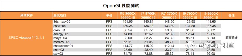 独显OpenGL基准测试,OpenGL部分以SPEC viewperf 12为基准测试,这个测试是针对显卡的专业运算测试,差距与CPU单线程关联度更高一些。