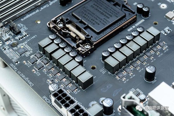 CPU核心部分为12相;PWM控制芯片为IR 35201,这是一颗8相的芯片,可以拆分成6+2;主板上通过6颗IR 3599的DRIVER芯片对CPU供电进行倍相处理,所以不是简单的倍相而是真实的12相阵列;输入电容为3颗尼吉康固态电容,容值270微法、电压16V;MOS为每相一颗IR 3558 DrMOS,额定电流45A;电感为每相一颗感值R30的铁素体电感;输出电容为10颗尼吉康固态电容,容值560微法、电压6.3V。