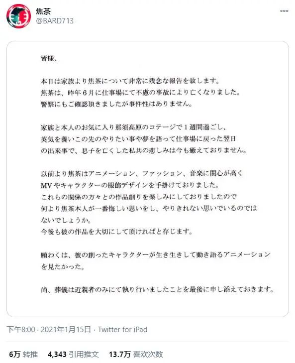 画师「焦茶」的家人通过焦茶的推特发布了一条讣告,焦茶已于2020年6月在工作时因事故意外去世。