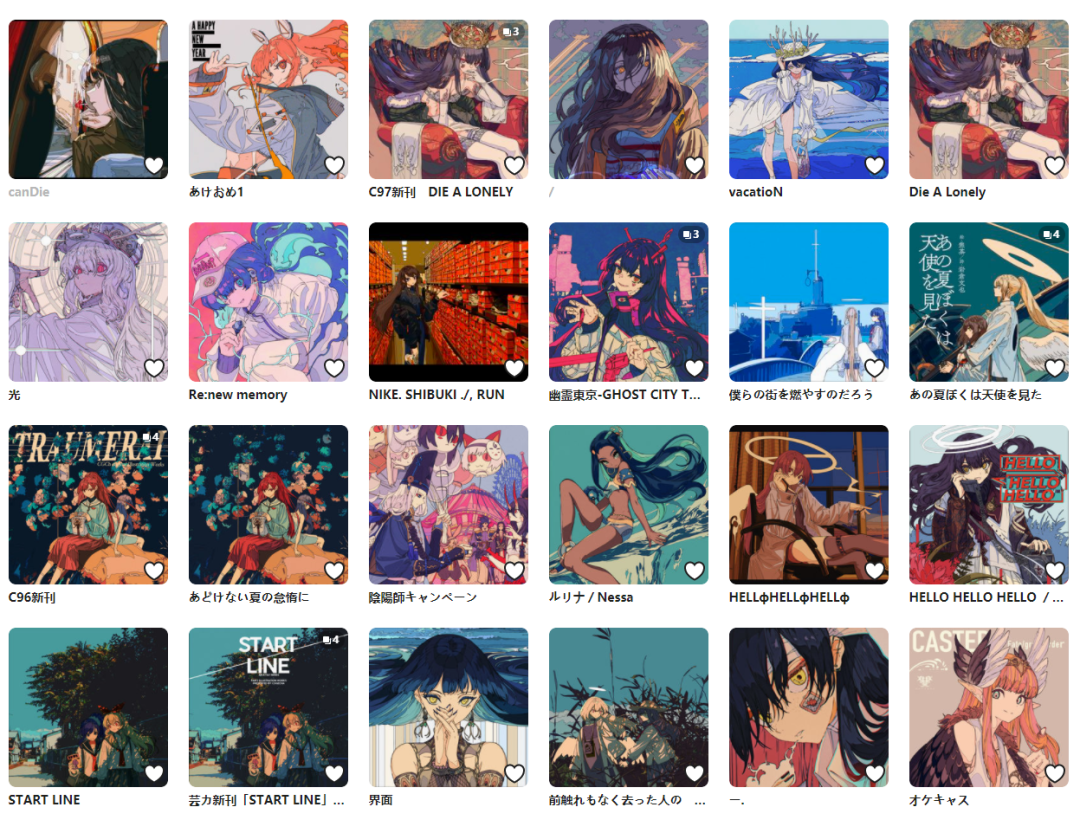 他的作品以丰富的线条极具特色的构图和鲜明的用色为人所知。他的笔下多是少女角色,复古清新的色调很容易让人联想到上世纪八九十年代曾经风靡一时的风格,但画风虽然复古,他笔下的角色却个个青春洋溢。