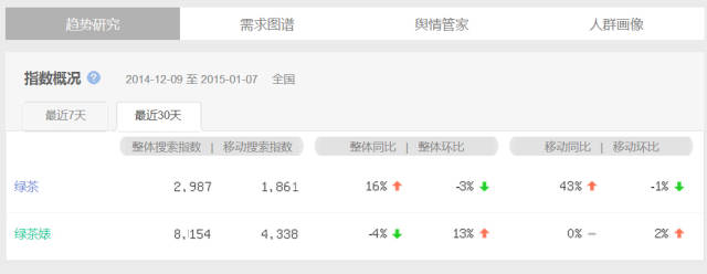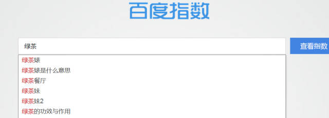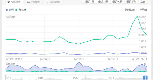 我在百度指数上搜索“绿茶”二字,结果如下,绿茶的核心词汇都被“绿茶婊”“绿茶妹”攻占了。绿茶党们再不崛起,江山就要被占了呀!