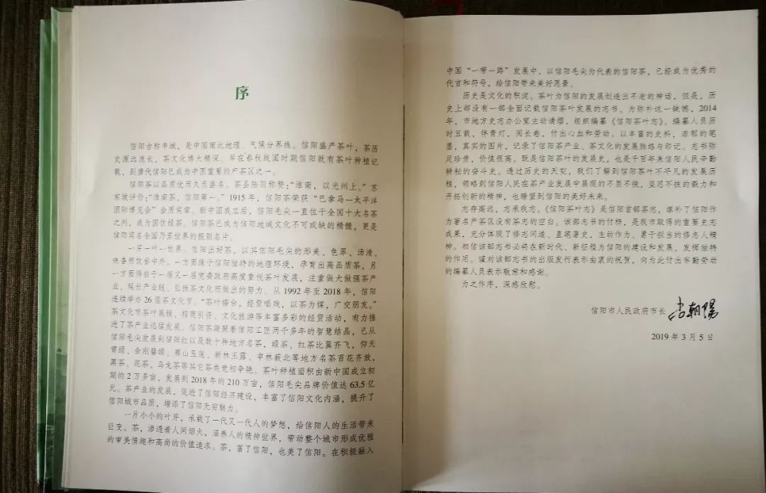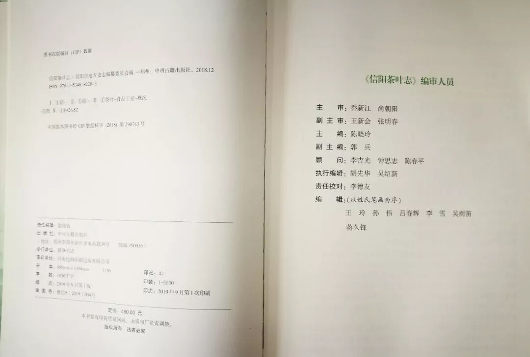 2019年底,信阳市地方史志编纂委员会主持、市地方史志办公室承编的《信阳茶叶志》由中州古籍出版社出版发行。市政府市长尚朝阳为该书作序。全书上限追溯至远古,下限记载至2014年,共104万字,图片429幅,是信阳市首部茶叶志。