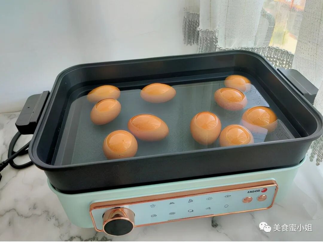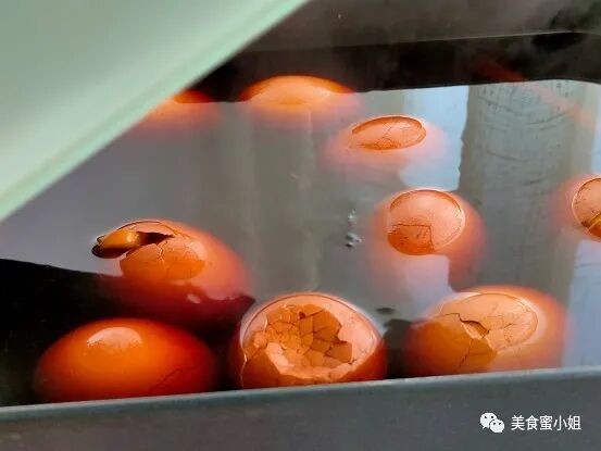 7、水再次烧开之后,就可以转成小火炖煮了,一般转成小火再煮30-40分钟左右就可以关火了。茶叶蛋好吃的秘诀就在于煮制完成之后,要把它们放在汤汁中浸泡半天左右,这样食用味道最佳。