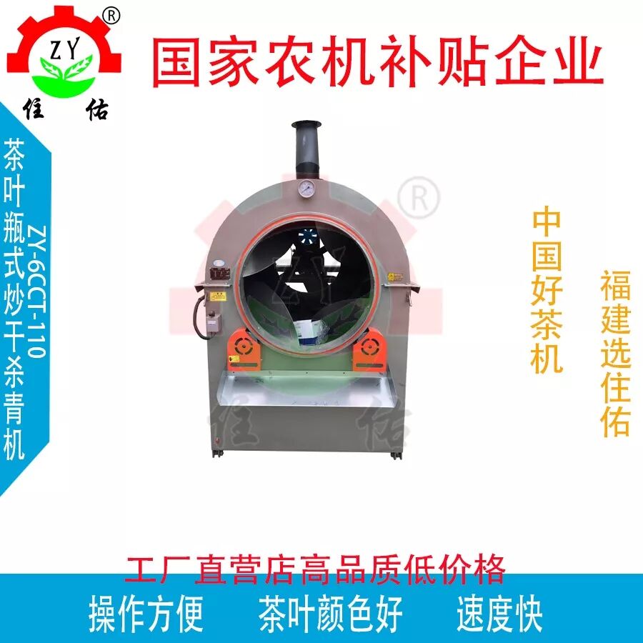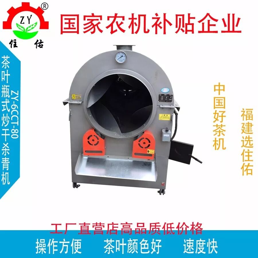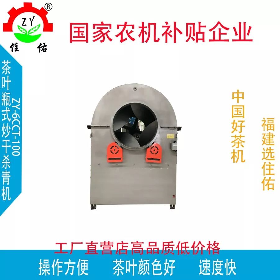 瓶式杀青机,柴煤式,在筒体下装有炉灶装置,都配有小型鼓风机助燃。筒内装有两段不同角度的导叶板,靠近进、出叶端的导叶板较里面导叶板高,以利于叶子迸出,里面的导叶板起翻抛作用。进、出叶在同一端,另一端装有风扇,以便排除水蒸气。杀青时间,视各地品种、季节及采摘标准的不同,靠倒顺开关人为地控制时间,以达到杀青的目的。