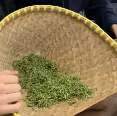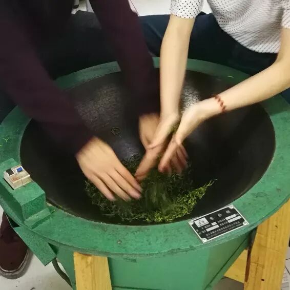 抓起茶叶,双手伸平搓动,卷曲、勾连的茶条开始神奇地变色、变细、变直。大家乐在其中。