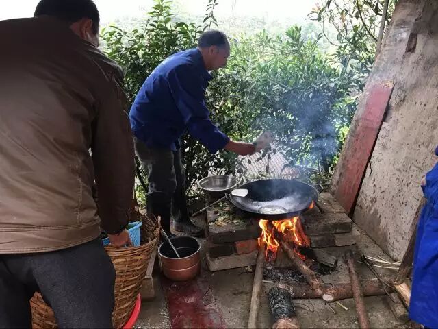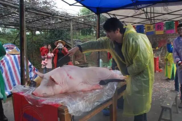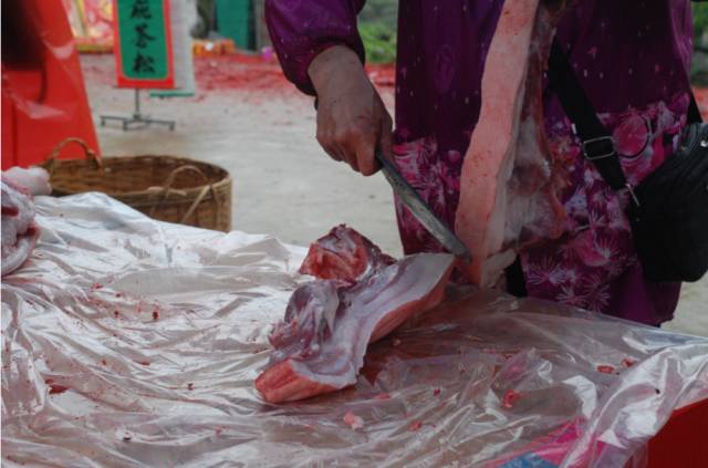 太公分猪肉敬献三牲、宣读祭文、祭天地、祭茶神等春茶开采仪式后,由黄总为我们的分社肉活动切下第一刀。