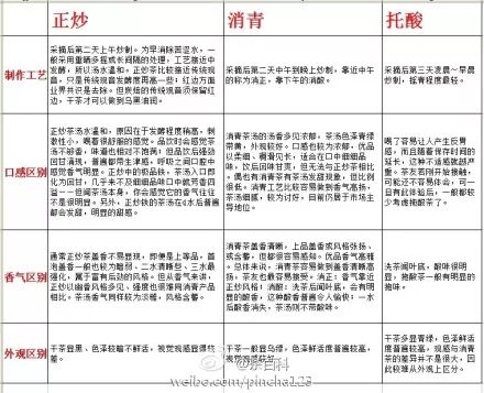 正炒:外形:正炒干茶显黑、色泽较暗不鲜活,视觉观感较差。正炒茶汤一般显黄;正炒叶底一般为土黄绿色调;2、消青:干茶一般显乌绿,色泽鲜活度普遍较高,视觉观感较好。消青茶汤青绿带黄;消青叶底一般介于墨绿色到土黄绿色。3、拖酸:干茶多显青绿,色泽鲜活度普遍较高,观感与消青茶的差异并不是很大,因此较难从外观上区分,叶底多墨绿。