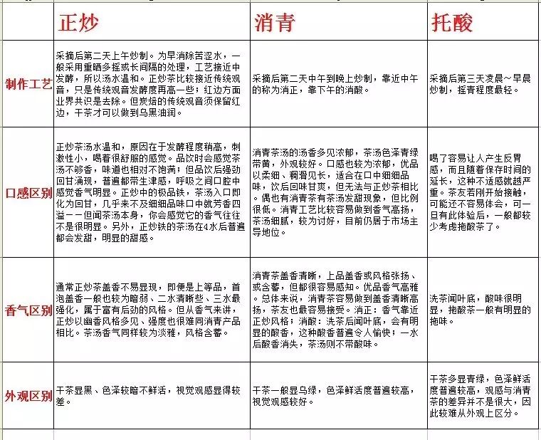 正炒:外形:正炒干茶显黑、色泽较暗不鲜活,视觉观感较差。正炒茶汤一般显黄;正炒叶底一般为土黄绿色调;2、消青:干茶一般显乌绿,色泽鲜活度普遍较高,视觉观感较好。消青茶汤青绿带黄;消青叶底一般介于墨绿色到土黄绿色。3、拖酸:干茶多显青绿,色泽鲜活度普遍较高,观感与消青茶的差异并不是很大,因此较难从外观上区分,叶底多墨绿。