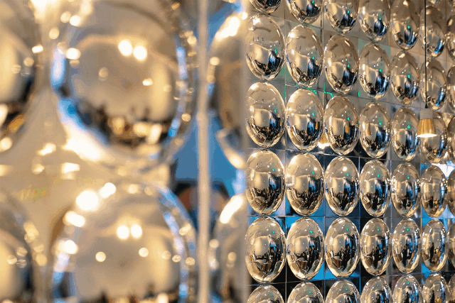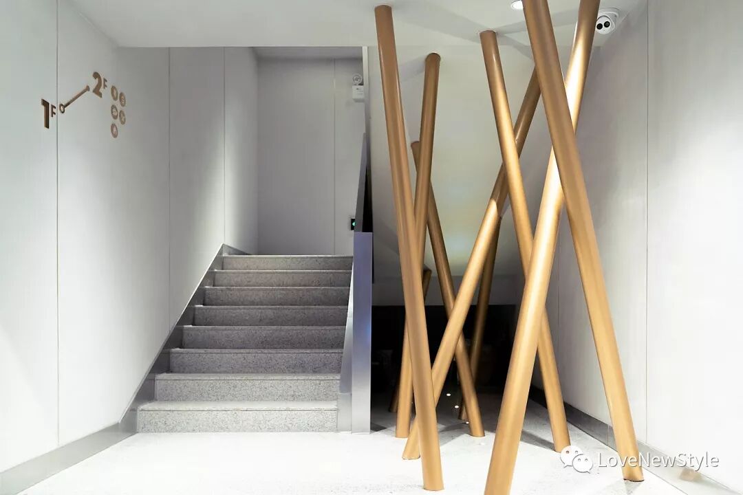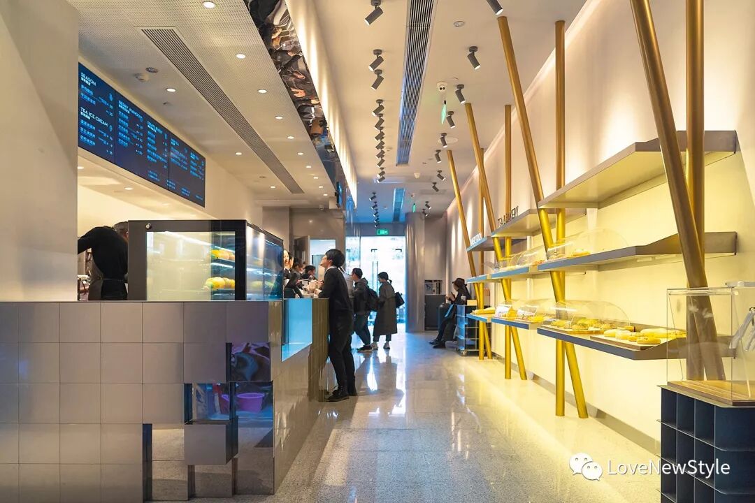 创意来自集市的热闹感:临时感的面包架、楼梯底交错的金色立柱装置艺术;碎片化吧台转角;嘉年华式银色太空保暖膜、极简随意陈列组合、散落黑暗系展台上的插画周边产品…以解构主义打破、拆解,重新混合组成一个崭新的LAB OR Select Shop。