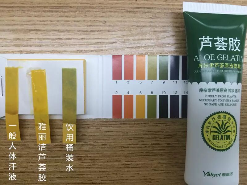 评测方法:用PH试纸分别测试一般人体汗液、雅丽洁芦荟胶、饮用桶装水的PH值,并进行对比。