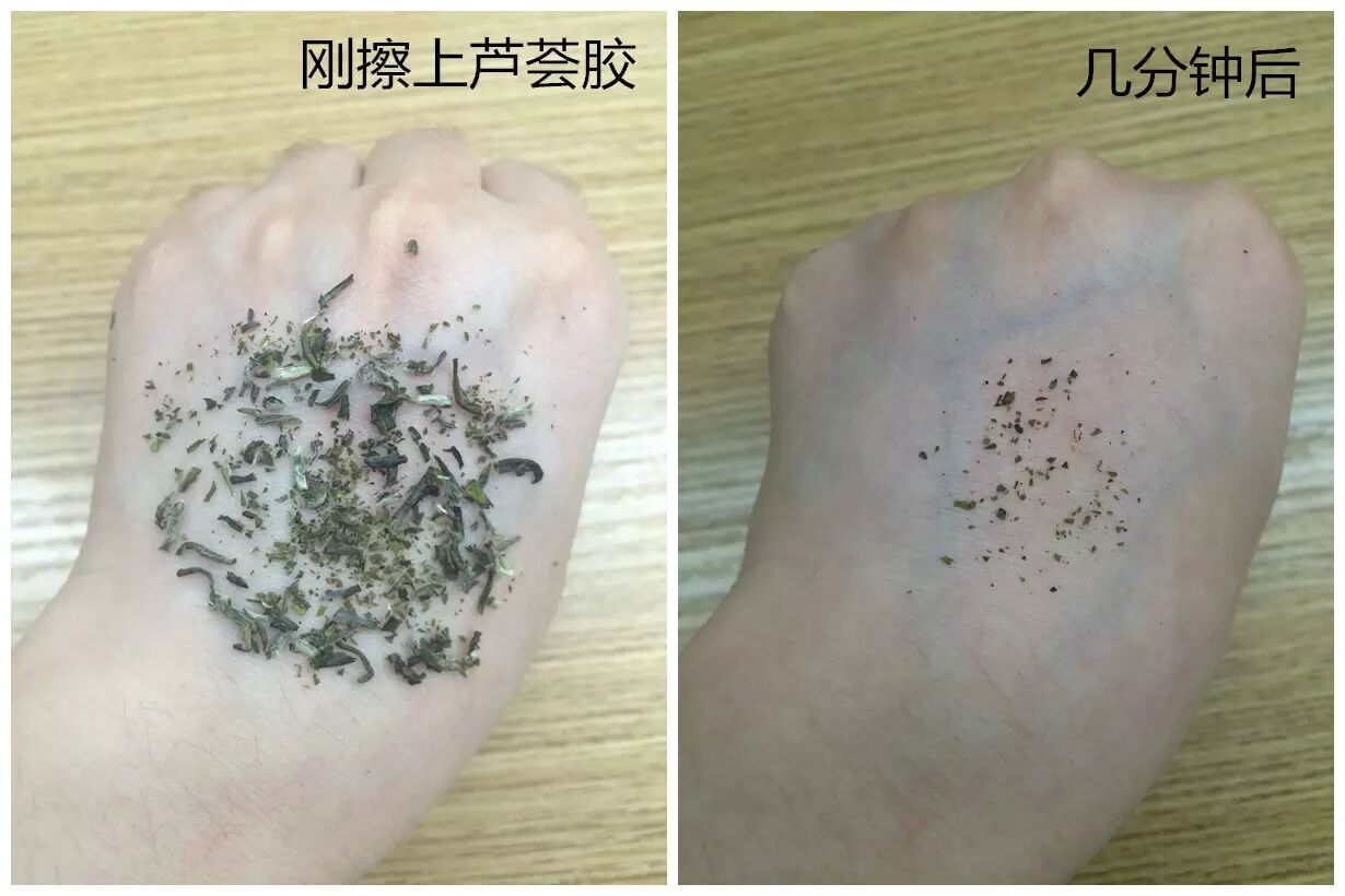 评测结果:从图片可知,几分钟后手背上留下少量的茶叶渣子,可见这款芦荟胶的清爽度高、吸收度好,能够为肌肤迅速清爽补水不粘腻。