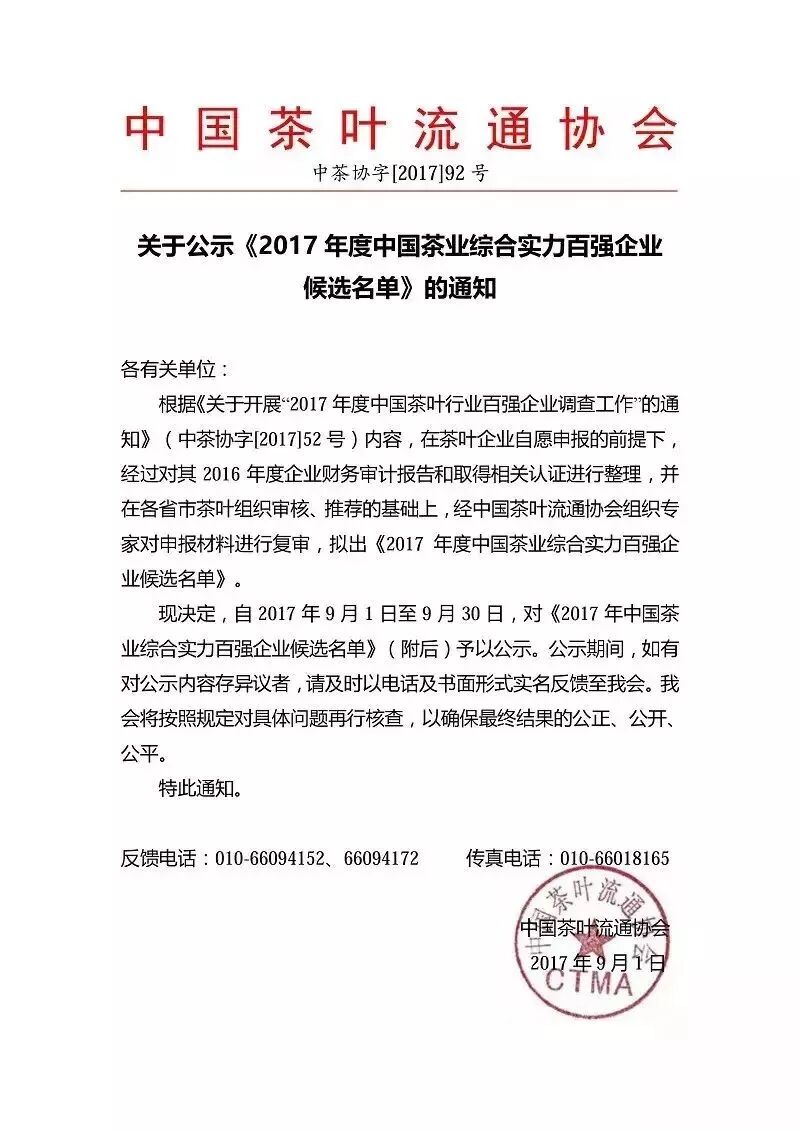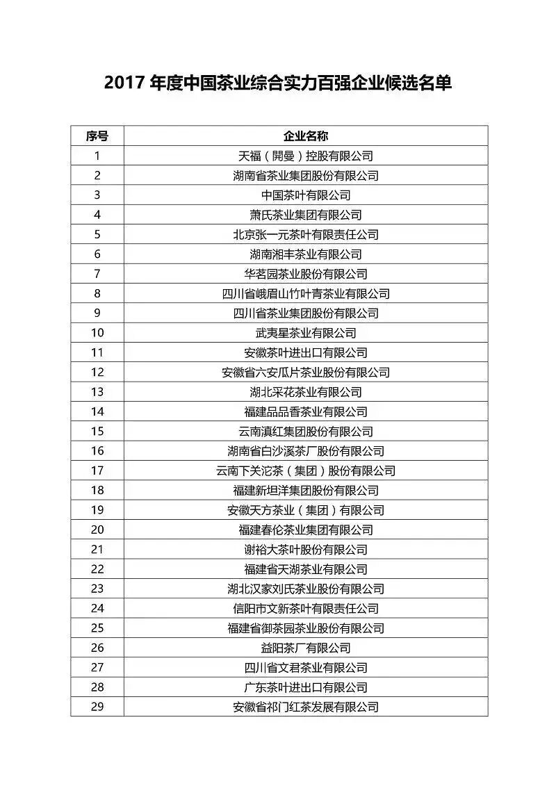 2017年9月11日,中国茶叶流通协会官网公示《2017年度中国茶业综合实力百强企业候选名单》,湖南省茶业集团股份有限公司排名国内茶企第一。