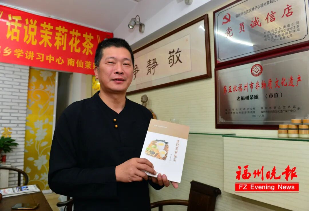▲翁文峰展示科普读物《话说茉莉花茶》。记者 叶诚 摄