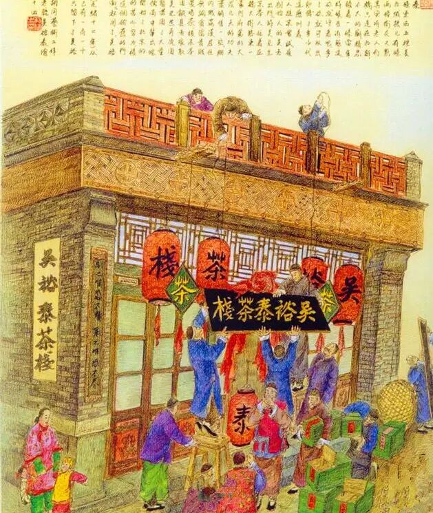 生意日渐红火,业务发展很快。吴先生经过数年努力积累了一些银两,便把这个大门洞买下来,经过修缮,建成店铺门面,起用了字号,以5块银元请老秀才祝椿年题写了第一块牌匾“吴裕泰”,茶栈正是悬匾开张。