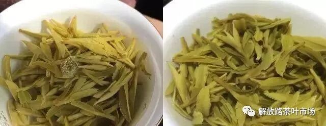 左:全手龙井43,右:全手群体种。从干茶形态来看,43更纤细,匀整度更好;群体种显得更花杂些。