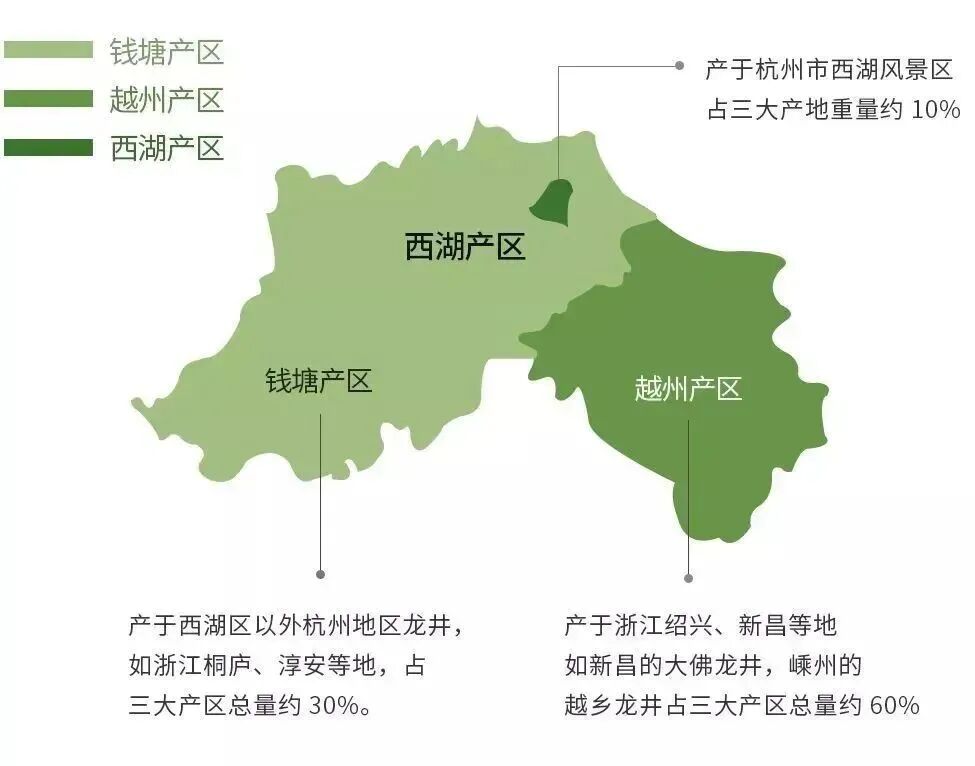 龙井茶区分布在西湖湖畔的秀山峻岭之上。这里傍湖依山,气候温和,常年云雾缭绕,雨量充沛,加上土壤结构疏松、上质肥沃,茶树根深叶茂,常年莹绿。从垂柳吐芽,至层林尽染,茶芽不断萌发,清明前所采茶芽,称为明前茶。炒一斤明前茶需七八万芽头,属龙井茶之极品。龙井茶的外形和内质是和其加工手法密切相联的。