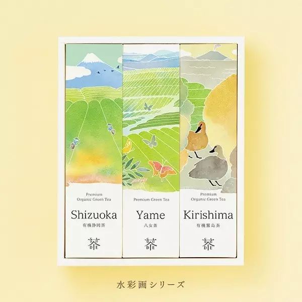 ,为了能跳出传统心理对茶叶产品的认知,日本的有机茶品牌saudade的VI设计采用的是现代水彩的表现手法,构筑了一个新的世界感。每一个包装的插图中所诉说的都是茶叶的“茶旅行”的主题。