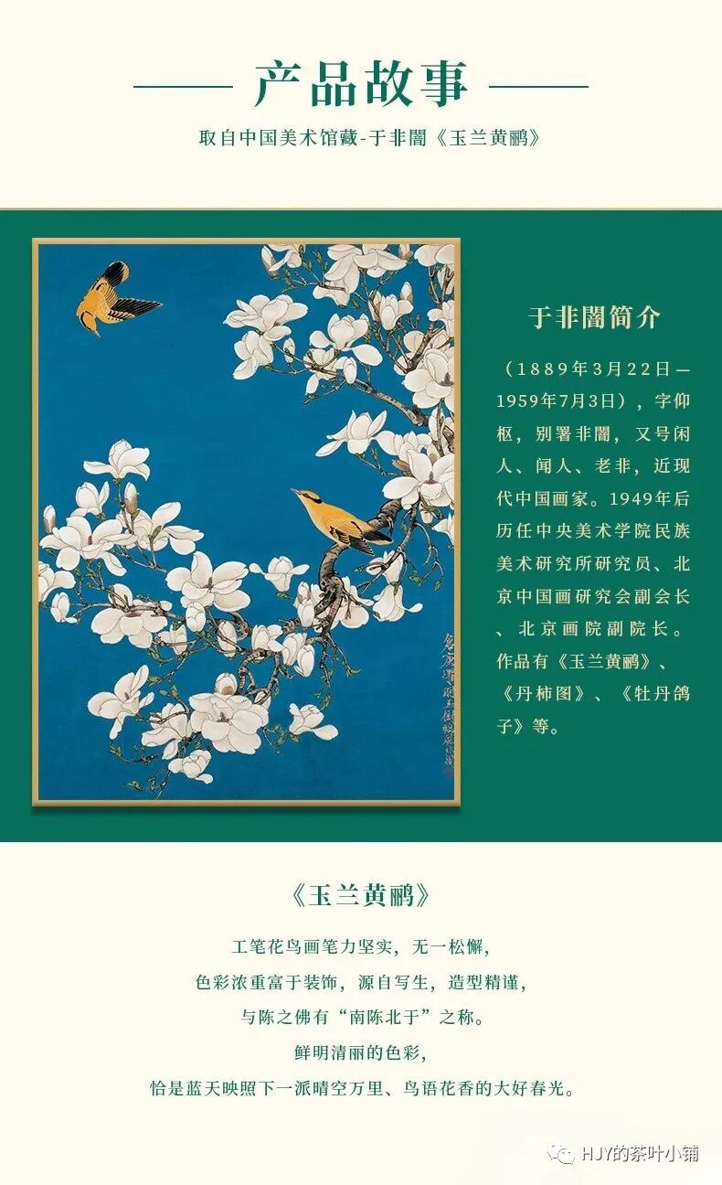 文新时刻设计理念:这款IP礼盒设计采用了近代中国知名画家于非闇的《玉兰黄鹂》作为主要创作素材,于非闇能再现一草一叶瞬间动态特点,而不似静物之拘板。设计提取画作中的黄鹂站在玉兰花枝的生动画面,在天猫猫头中增加了少年在山间比武的剪影,并在圆盒上下添加玉兰花形成花朵簇拥的构图,凸显春日下花朵盛开黄鹂声声少林比武的场景。兼艺术与文化于一体,感受大自然的魅力!
