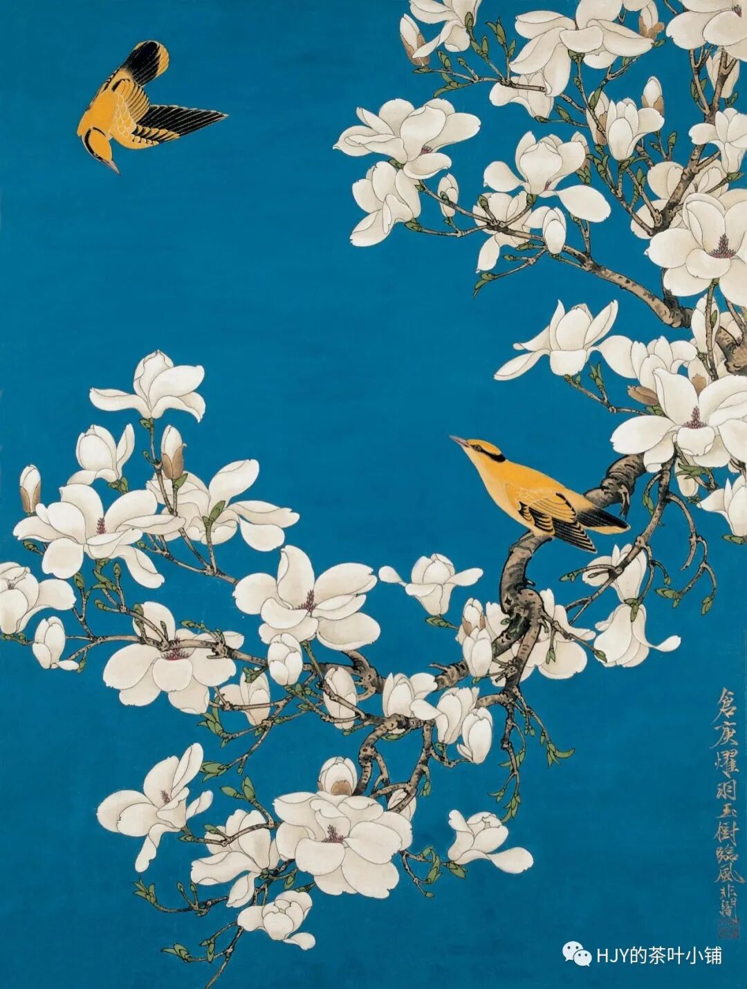 《玉兰黄鹂》即为其一。玉兰在北方绽放在早春时节,有玉树临风之姿。仓庚即黄鹂,《诗经》里有句曰:“仓庚于飞,熠耀其羽。”画家便以此为艺术形象并用石青为底色来烘托玉兰和黄鹂。这鲜明清丽的色彩,恰是蓝天映照下一派晴空万里、鸟语花香的大好春光。