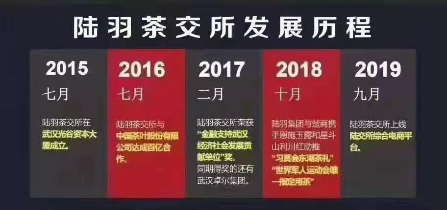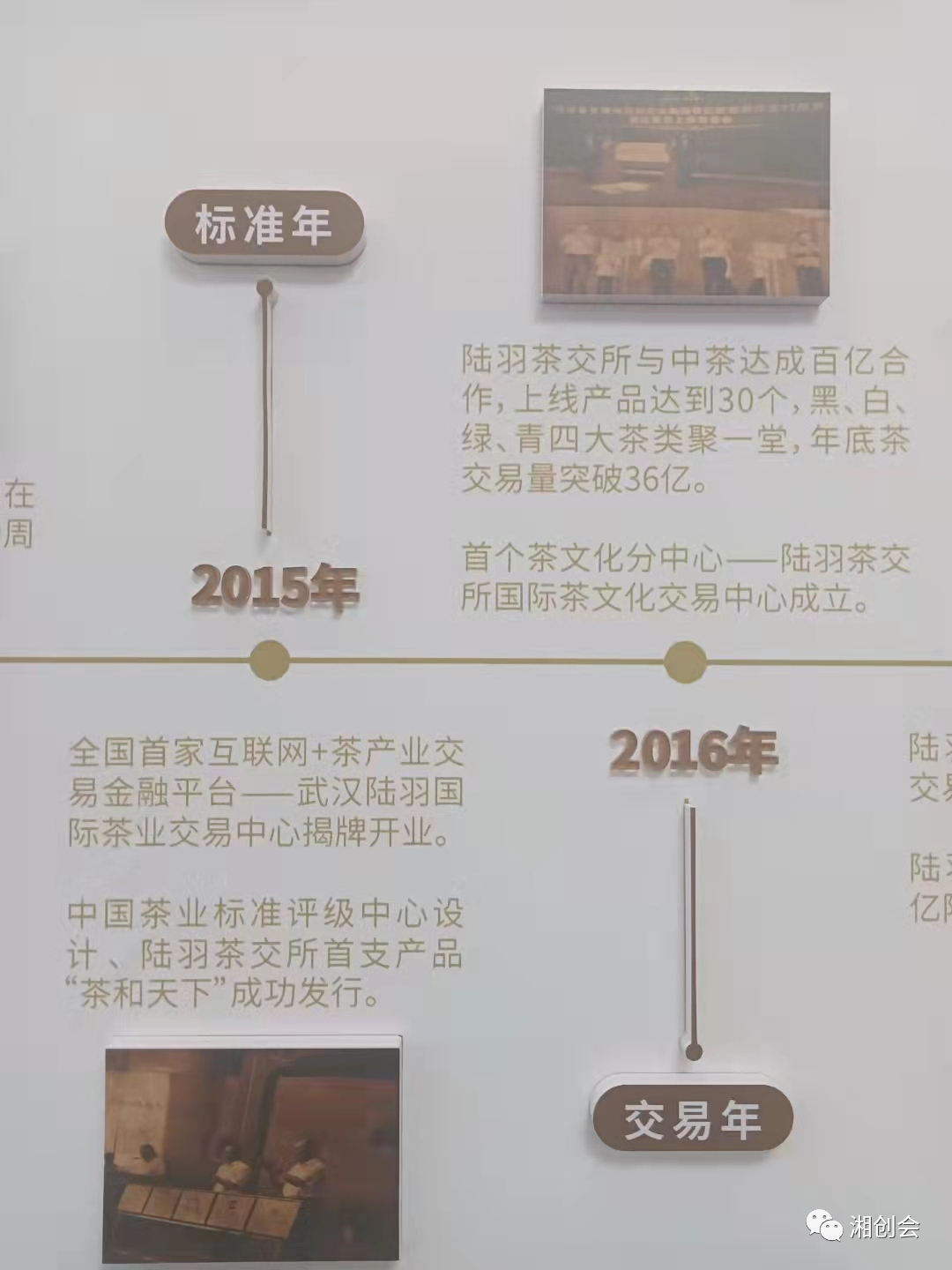 2015年,全国首家互联网+茶产业交易和金融平台--武汉陆羽国际茶业交易中心揭牌开业。中国茶业标准评级中心设立,陆羽茶交所首支产品“茶和天下”成功发行。