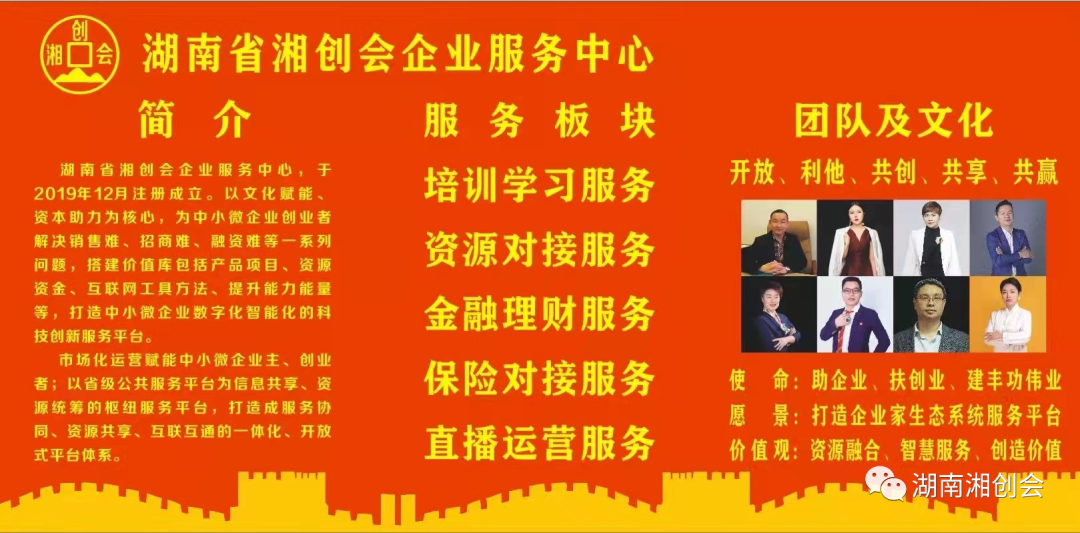湘创会联合志者、聚合能者、融合慧者,我们将常态化的进行资源对接会和路演活动,深入对接合作靠谱的:培训学习服务、资源对接服务、金融理财服务、项目咨询运营服务等为湖湘创业者和中小微企业主赋能!