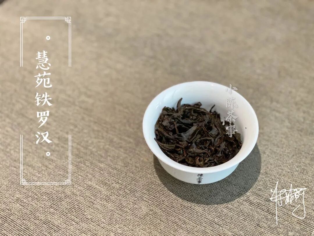 用通用版的无字小泡袋包的茶,上面用黑笔写着,慧苑老丛,慧苑铁罗汉,慧苑肉桂,花丛,木质丛。