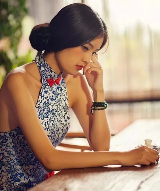 美女喝茶图片3、穿上由旗袍改装成的青花瓷花纹露肩长裙的喝茶女孩儿,散发东方女性的优雅,与中国茶道的儒雅气质相映得彰。