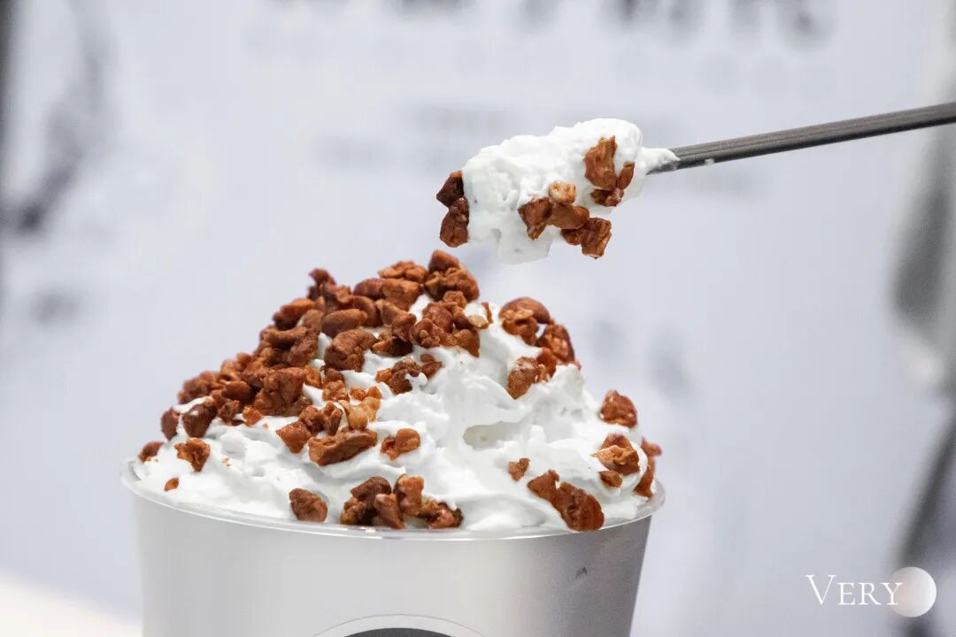 “先挑后喝”的吃法更加有风味,首先使用定制的细吸管挑起雪顶奶油和山核桃碎一起吃,芝士奶油绵密,核桃脆香。