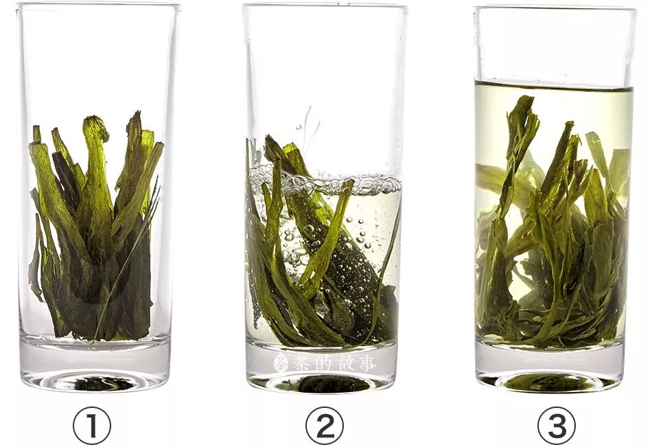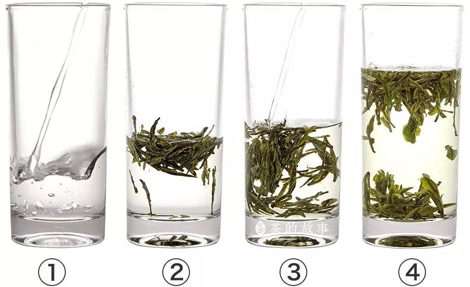 操作:先将开水注入杯中约1/3处,待水温凉至90℃左右时,将茶叶投入杯中,稍稍转动玻璃杯让茶叶浸润,再将约80-90℃的开水徐徐加入杯的七分满处,稍后即可品茶。