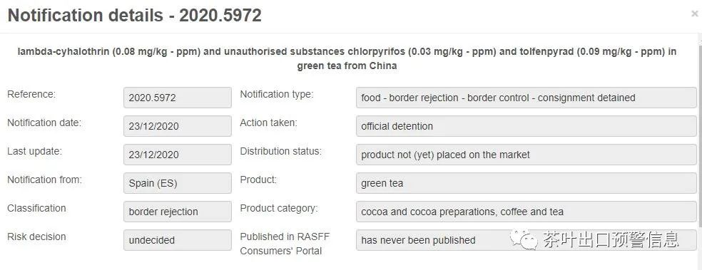 事件详情:来中国的绿茶中检出高效氯氟氰菊酯0.08mg/kg, 毒死蜱0.03mg/kg以及唑虫酰胺0.09mg/kg。