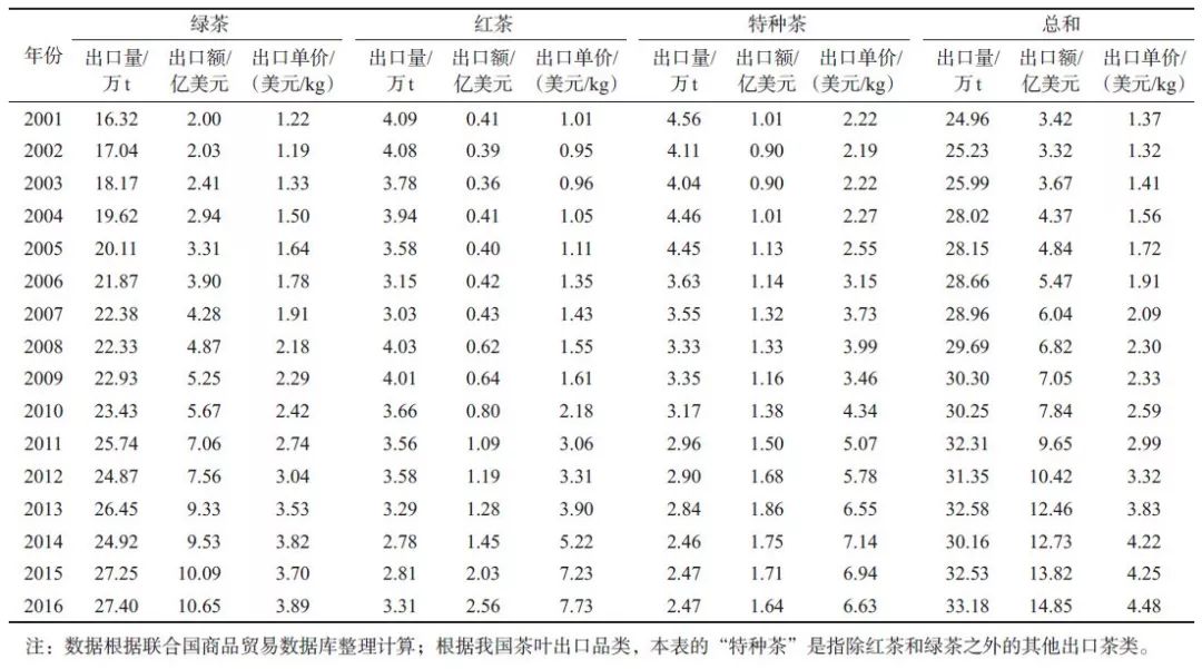 我国茶叶出口主要包括绿茶、红茶、特种茶3类,其中绿茶出口规模世界第一,占世界绿茶贸易的80%以上。近年,我国绿茶出口量从2001年的16.32万t增加到了2016年的27.40万t,年均增长3.5%;我国红茶、特种茶的出口量则在波动中下降,红茶从2001年的4.09万t减少到2014年的2.78万t,年均降幅2.9%;特种茶则由2001年的4.56万t降至2016年的2.47万t,年均降幅4.0%;相应的,绿茶在我国茶叶出口总量中的比重由2001年的65.36%增加到2015年的83.77%,红茶的比重由2001年的16.39%减至2015年的8.63%,特种茶的比重由 2001年的18.25%降至2016年的7.44%。