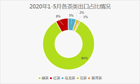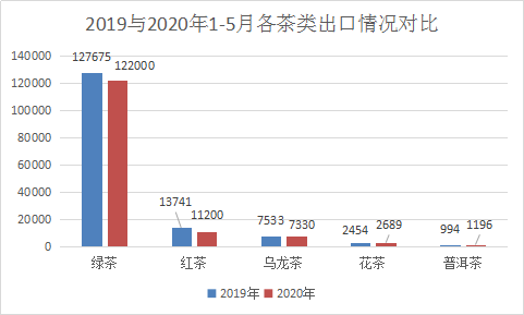 2020年1-5月,红茶出口量降幅明显,绿茶、乌龙茶微降,花茶和普洱茶有不同幅度增长。具体见下图: