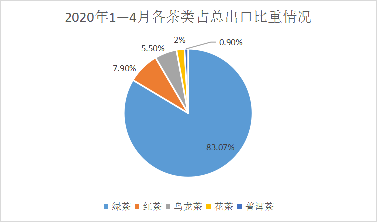 分茶类看。2020年1-3月,中国绿茶出口量为5.95万吨,占总出口量比重为82.5%,减少0.60万吨,降幅9.1%;红茶出口量为6218吨,占总出口量比重为8.6%,减少2173吨,降幅25.9%;乌龙茶出口量为4068吨,占总出口量比重为5.6%,增长136吨,增幅3.5%;花茶出口量为1585吨,占总出口量比重为2.2%,减少128吨,增幅8.8%;普洱茶出口量为734吨,占总出口量比重为1.0%,增加65吨,增幅29.7%。