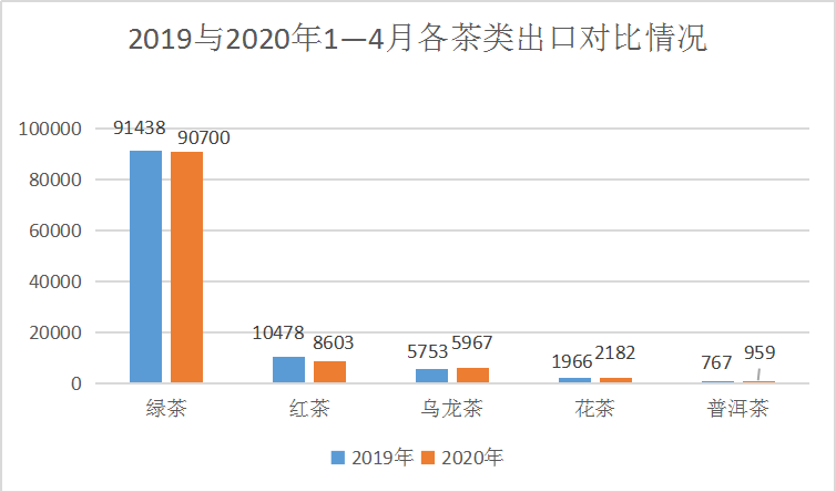 分茶类来看,2020年1-4月,红茶出口量下降较多,绿茶基本持平,其它茶类均有不同幅度增长,具体如下图所示: