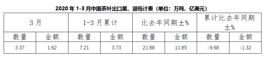 2020年1-3月,中国茶叶累计出口量为7.21万吨,同比减少9.68%;累计出口额为3.73亿美元,同比减少1.32%;出口均价为5.17美元/千克,同比上涨9.26%。