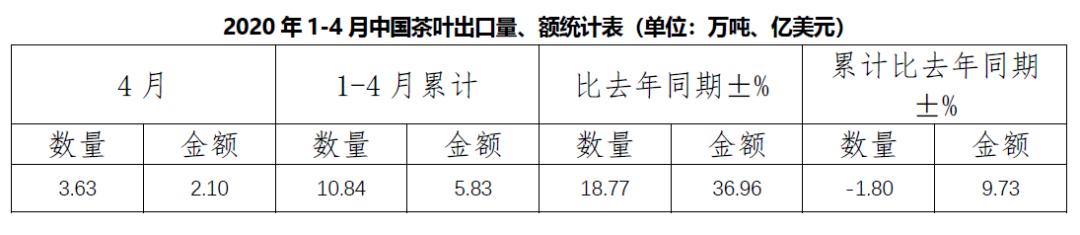 2020年1-4月,中国茶叶累计出口量为10.84万吨,同比减少1.8%;累计出口额为5.83亿美元,同比增加9.73%;出口均价为5.37美元/千克,同比上涨11.75%。