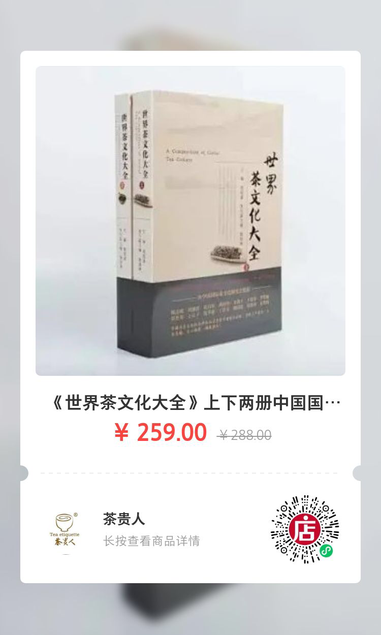下面这些专题文章都还不错,直接点击进入阅读:《世界茶文化大全》,茶文化至佳百科全书!茶界知名专家学者联合精心打造【茶周刊】2020最值得阅读的十大茶书2020年茶贵人茶书销售盘点及热榜“2020茶媒推荐阅读十大茶书”榜单发布!刘仲华:由引流顾客实现销售转变为锁定顾客挖掘销售重磅!刘仲华 尹祎联合主编《茶叶标准与法规》新近出版院士联袂讲茶,饮茶可以预防多种疾病喜讯!三门茶学课程入选国家级一流本科课程深入学习,唱响陕茶发展中的秦岭文化坐标王岳飞:茶叶保健知多少?(建议收藏)陈宗懋院士【饮茶与健康】公开课深度解读 | 知识经典茶书荐读:姚国坤著《中国茶文化学》王岳飞:茶与生活同行,坚持科学饮茶刘仲华在第六届中华茶奥会上的演讲:基于健康中国的茶业机会。屠幼英:黑茶未来发展之路的思考刘仲华院士:疫情下中国茶业健康发展的思考王旭峰:他站在茶席旁,视野是与西方文化平起平坐的 | 荐读国家级技能大师教您简单泡好一杯茶!| 领读从技到艺:潮州工夫茶的现代性欢迎全国各地各级茶叶部门茶业协会茶文化研究会茶人联谊会茶叶商会以及茶企经营机构采购专业正版茶书,茶贵人茶书微店一站式解决,联系茶贵人小编(:189 9195 6216)。切记先领券再下单,点击左下“阅读原文”查看完整书单~↓↓↓