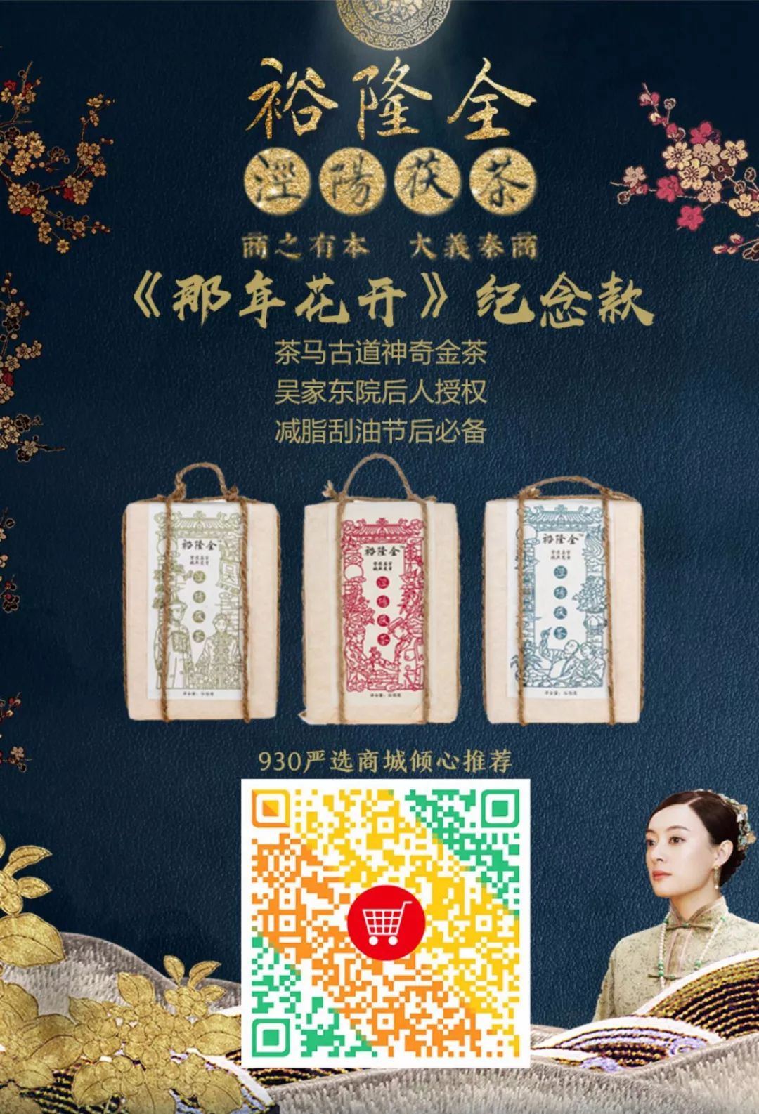 剧中所讲述的“裕隆全”正是吴家东院传承百年的商号,为了让大家一品裕隆全金花茯茶的滋味,目前930与吴家后人已经直接达成合作,严选把关,保证你能品到真正的裕隆全茯茶,目前已经在930商场上架咯!而且930商城售卖的还是《那年花开》纪念款,包装上的手绘图,有没有勾起你对剧情的回忆呢?