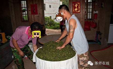 包揉是个体力活,一般只有男人才能做得来,有少数的妇人也会,反正我是打死也不会,力气不够,一个茶季结束后做茶的男人的双手会长满茧子,而且手都是黑的,因为茶有茶汁,也许有人会问,不是有压茶机吗?压一压多省时省力啊!有的,但我们不用,越是机械化的现在,我们越想尽量保留传统的,当然了,回到原始的传统那是不可能的了,所谓的纯手工我理解的是,所有的步骤不经过机器,包揉的时候用脚,你敢喝不,亲!