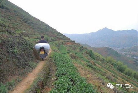 一般茶青采到五六十斤就要运回家,由于地势太高,摩托车上不去,只好先扛下山再载回去