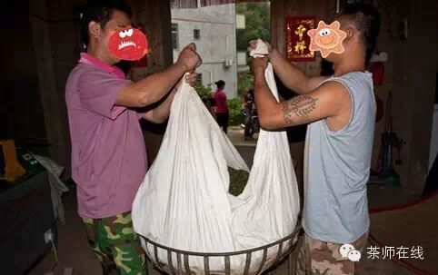接下来是包揉的环节,将炒好的茶青放在茶巾里,一般一个茶球是50斤茶青(应图中主人公要求图片做了处理,因为他们说长得丑不是他们的错,出来吓人就是他们的不对了)