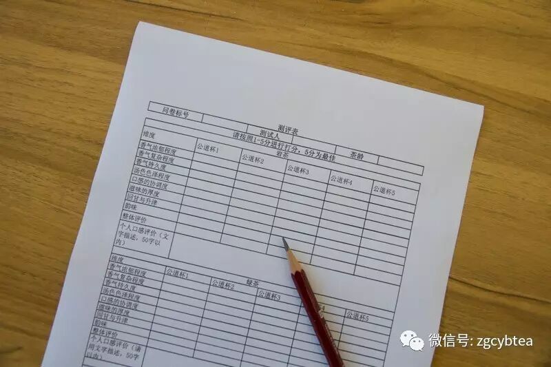审评表单由茶语网非著名男主播“叶老师”(专业组成员)以及茶语茶评组阳老师共同设计,分别从茶汤的色、香、味、韵等多个角度进行测评,项目其中包括:香气的浓郁程度、复杂程度、持久度、汤色色泽程度、口感协调度、滋味的厚度、回甘与生津和韵味。