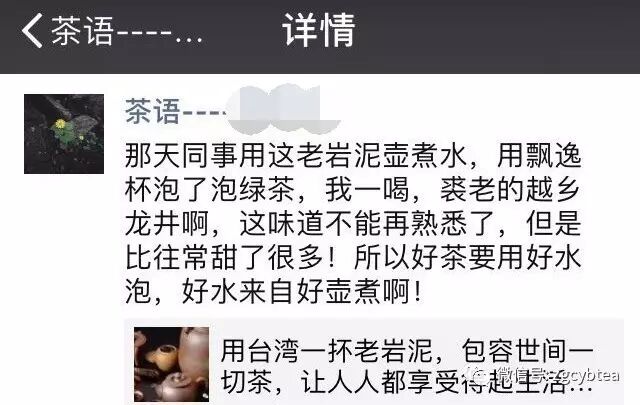 昨天下午,当《用台湾的一抔老岩泥,包容世间一切茶,让人人都享受得起生活的美好》(点击标题即可查看)的稿子在茶语网平台发出来后,茶语小伙伴的圈里很快就出现了这样一条:
