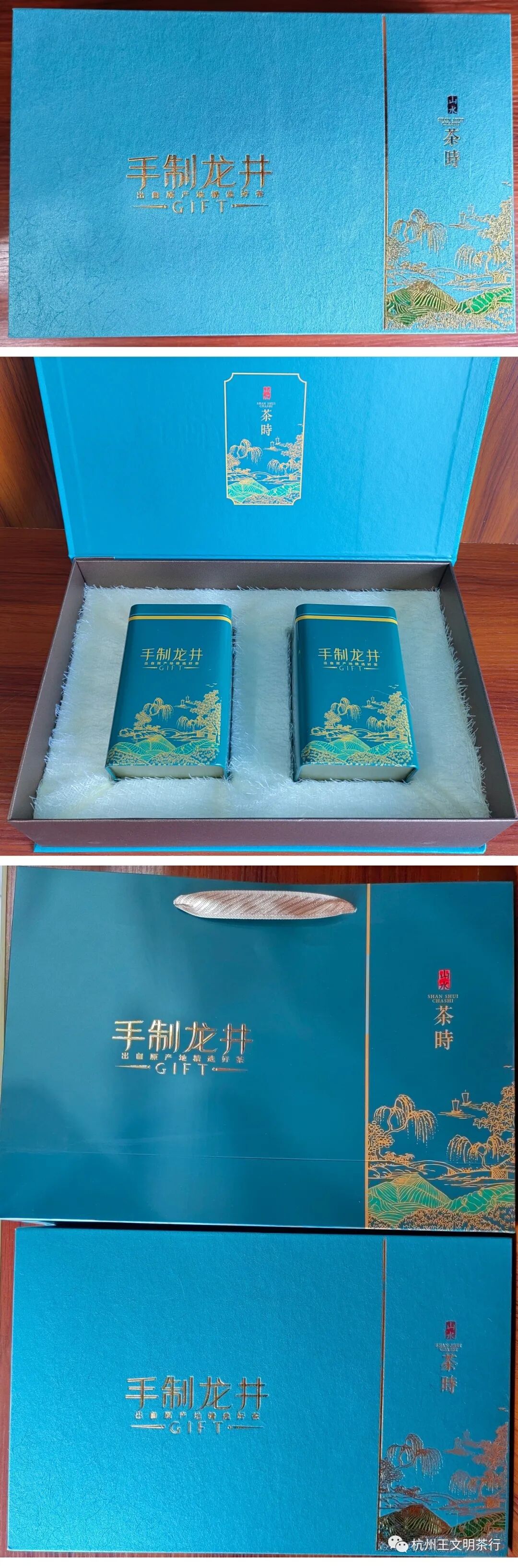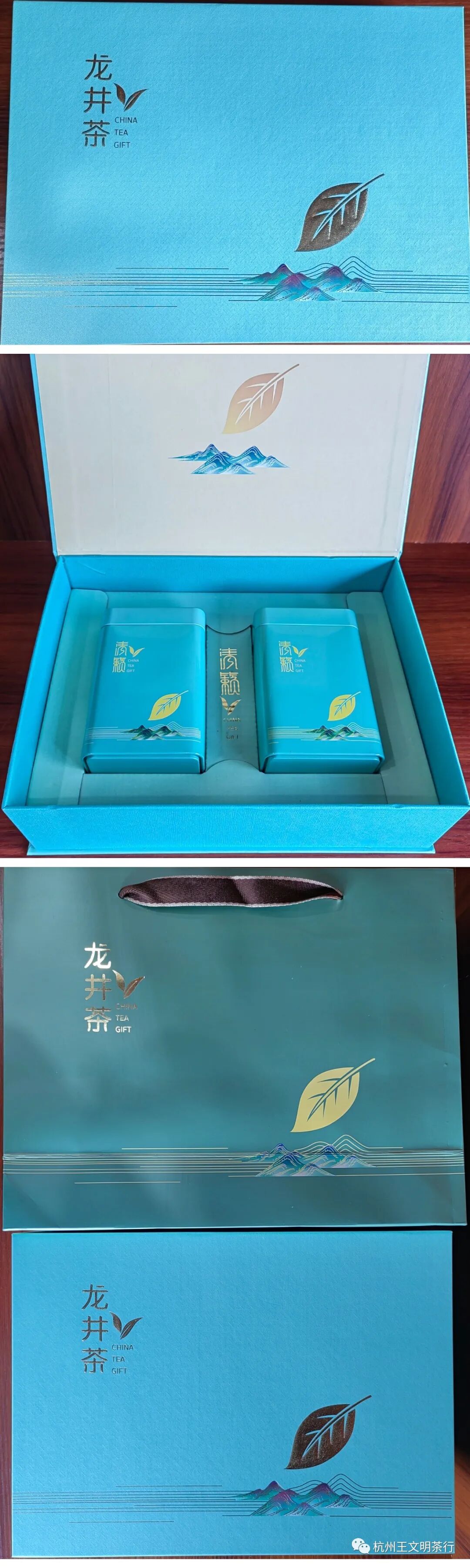 内装125克同款铁罐2个,并配同款外提袋一个,可装龙井茶250克,外部尺寸(cm):30*22*9;净重:0.743公斤