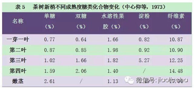 此外,茶梗作为鲜叶的营养传导器官,含有较高的糖分。茶鲜叶中含有很多糖类,除水溶果胶外,成熟叶、茎中几乎有的糖类均比幼嫩芽叶高(表5)。此外,高糖含量是黑茶鲜叶原料的重要生化特性,这是幼嫩芽叶所不能替代的。鲜叶原料这一生化特征,与黑茶品质的甜醇滋味的形成密不可分。