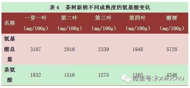 氨基酸是一种重要的滋味物质,在茶汤中起着鲜、甜滋味的主体和调合作用,同时对茶叶香气的形成有着重要影响。嫩梗中的氨基酸含量比芽叶多的多,特别是其中的茶氨酸,嫩梗的含量比芽叶高1-3倍(表4)。这主要是由于茶氨酸在根部合成,经木质部输送到地上部分之后,一部分产生谷氨酸参与茶树氮代谢,另一部分在新梢中积累,所以嫩梗中氨基酸(特别是茶氨酸)含量高。