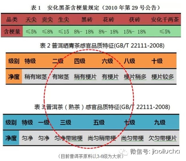 而乌龙茶、普洱茶、黑茶的采摘标准中,都是需要较为成熟的鲜叶,所以在这三类茶里,茶梗的存在是很正常的现象。国家质量监督检验检疫总局公告对于安化黑茶和普洱茶等品类的含梗量有明确的规定: