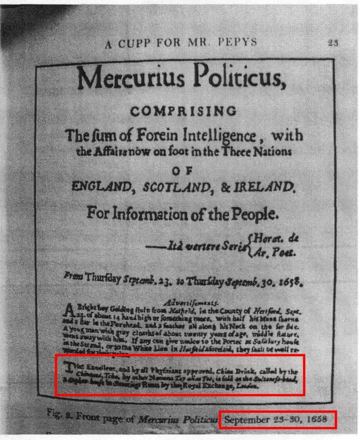 大意为:曾由各医师证明品质优异的中国饮料,中国人称茶,其他国家称为Tay或者Tee,现在伦敦皇家交易所旁Sweetings Rents的Sultaness-head咖啡店出售。这是第一次在报上宣传茶叶的广告,用了“Excellent,and by all physicians approved”这类修饰词语,登了一个星期之久。